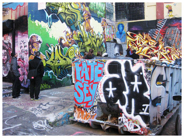 除了在旁邊的牆上 寫下名字之外,還有很多方式,有時候他們會在畫中藏自己的名字! 所以一整個塗鴉中,你看到一個個的小英文字,大部份就是作畫人的名字!而這些團體,也會在作畫的時候,很遵守不成文的規定,他們不會覆蓋掉別人原先在上頭的名字,以示尊重!
