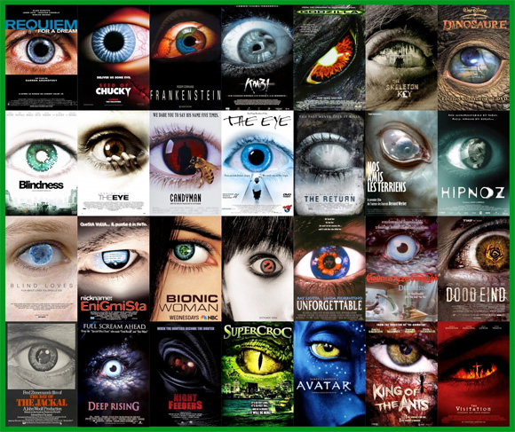 透過他詳盡的分類,你不難看出好萊塢電影海報的有其設計的邏輯在,像是動作片就會偏好黑白色調,然後多少會有個人在奔跑之類,而驚悚片則偏好置中大瞳孔,唯一不同只有在角膜變色片的花紋(誤)。