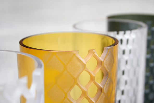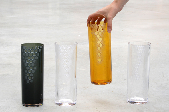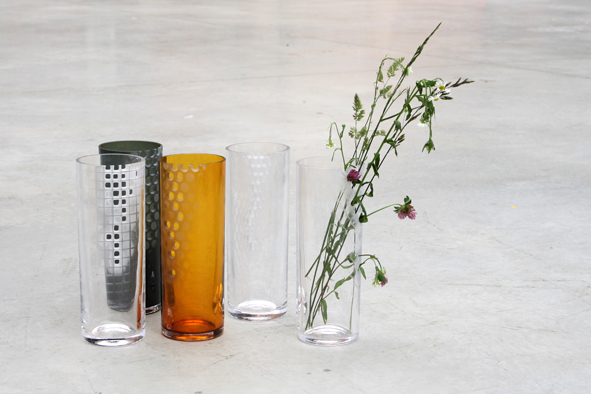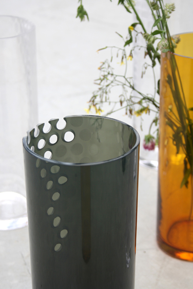 這位德國的設計師也同時出了一款相當有意思的花瓶作品,瓶身上有許許多多刻意開的孔洞,而且是獨一無二個別噴砂製作,在花束擺進去的同時,你可以每種花分別擺在不同的洞裡面,讓花朵呈現最自然散開的形體,和鏡子搭配擺在一起真的是別有一番獄中作樂的風味阿!