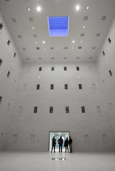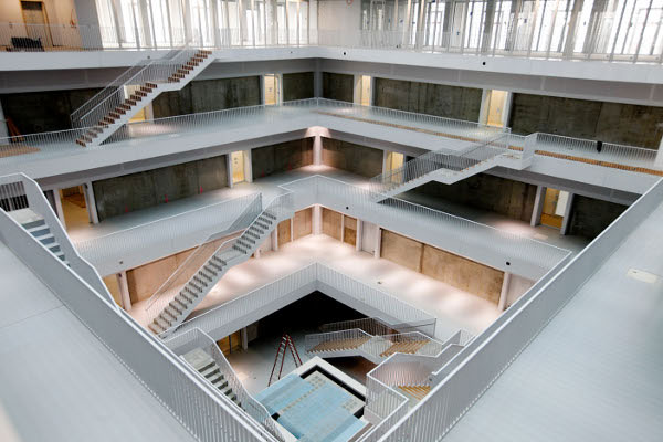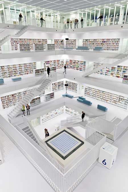 這獲得許多國際媒體讚譽的斯圖加特市立圖書館是由韓國設計師 Eun Young Yi所設計,在1999年全球235件建築競圖中脫穎而出的優秀設計;Eun Young Yi 設計一個地下二樓,地上九層樓的純白巨大立方體,而圖書館全館皆無直接照明,並同樣使用白色為主調,環型中空的通透設計更凸顯開放空間感的溫暖感受,完全沉浸在閱讀的喜樂之中。[image credit]