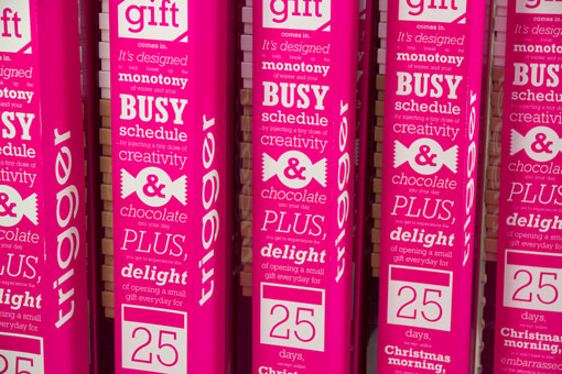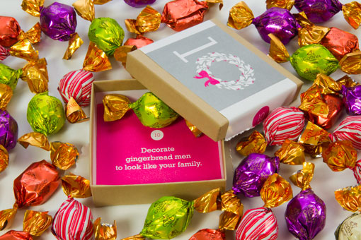 由創意總監Jonathan Herman和設計師Shauna Luedtke共同設計出了25天巧克力,外面用最喜氣最順眼的洋紅色代表最愉悅的禮物,裡面足足有25天份包裝的小盒子,小盒子分別用了白色的底色,卡 其色和黑色,以8天8天9天分成三個部份,當對方收到開始不一樣顏色的盒子時,就代表距離聖誕節又更進入一個階段啦!