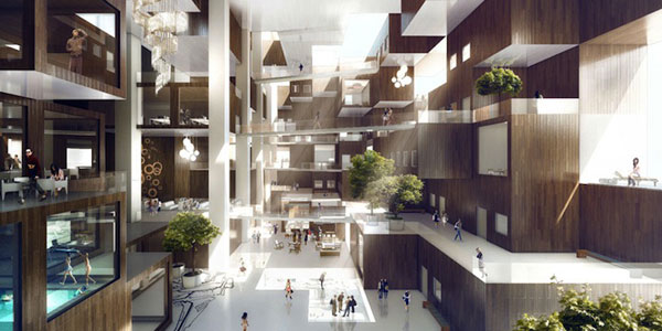 The Cloud是由兩棟聳入雲端的大樓(一棟853呎高,一棟984呎高)組成,透過十層樓高的「雲朵」連結,從外觀來看,還真有穿越雲霄直達天廳的意境,從功能來看,餐廳、健身房、咖啡廳、會議室和花園、沙發區全都設置在此,也算是和其他樓層完全區隔開來。