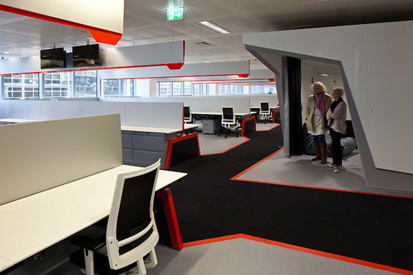 最新的Google倫敦辦公室主體色系以白色為主,搭配充滿幹勁的紅色跟沉穩的紫藍色,營造出相當現代感的工作氣圍,而該有的咖啡廳、會客室、會議室等應有盡有,工作空間也摒除了傳統的OA隔間,而採用開放式的工作桌面,看起來格外的清爽。
