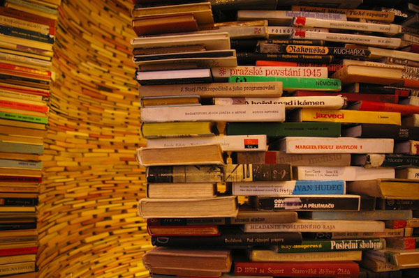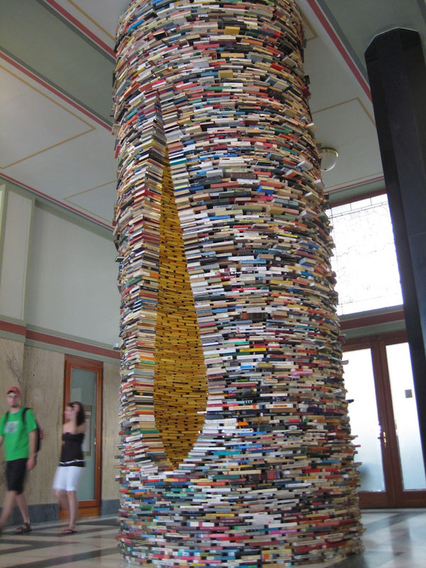 利用書本的創作真是無窮無盡,斯洛伐克藝術家Matej Kren日前在布拉格市立圖書館,創作了以書本搭建書塔的裝置藝術,從外觀看起來就像是一座從地面連接到天花板的垂直書塔,Matej Kren並且在塔內上下裝上了鏡子,讓塔內空間反射之後,從裡面看起來就像是個無窮無盡的無底書洞,視覺上的效果相當耐人尋味。