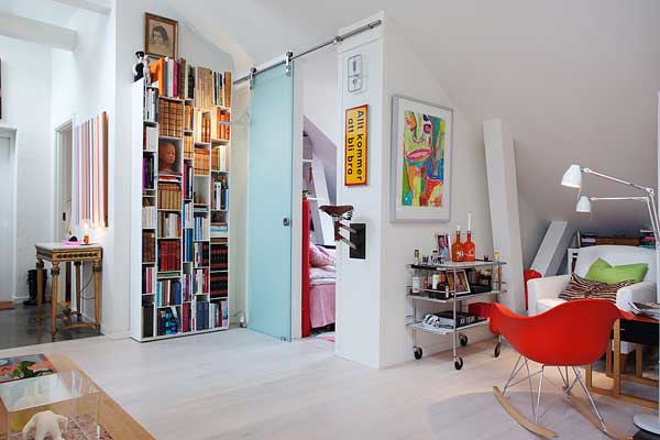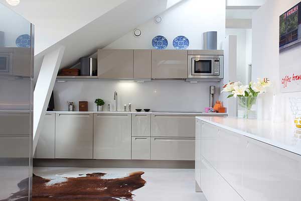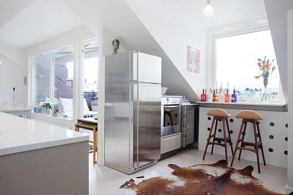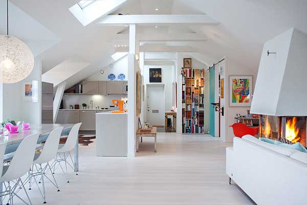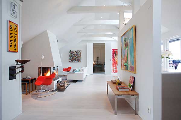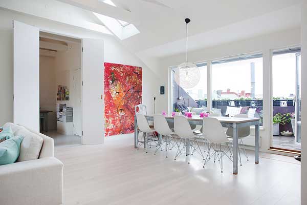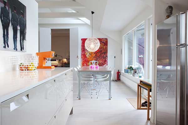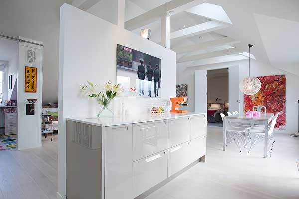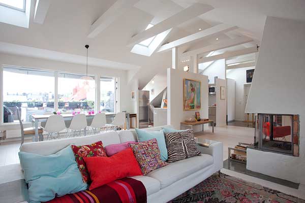 位於瑞典的斯德哥爾摩的頂樓小宅,有著北歐慣有的清爽風格,採光良好,無非是希望讓陽光能夠奢侈的灑落下來。白色基本色調下,少隔間的開放式格局,更顯明亮開闊;多彩的家飾配件,是亞洲居家佈置時少有的鮮艷,為寒冷的北歐氣候增添點暖和的氣息。