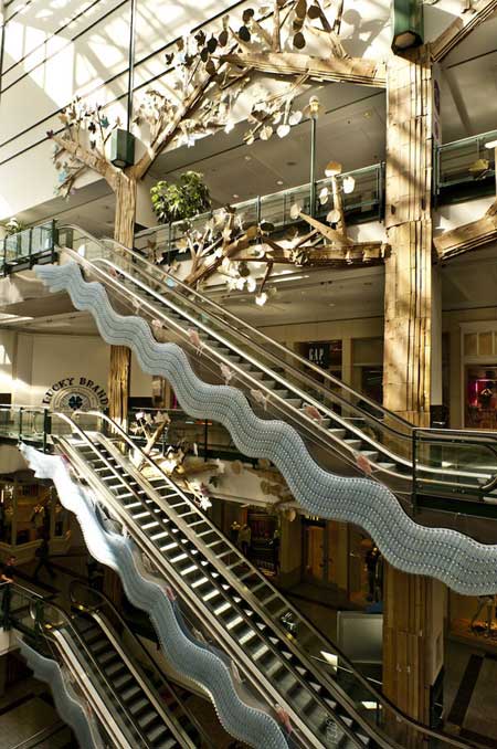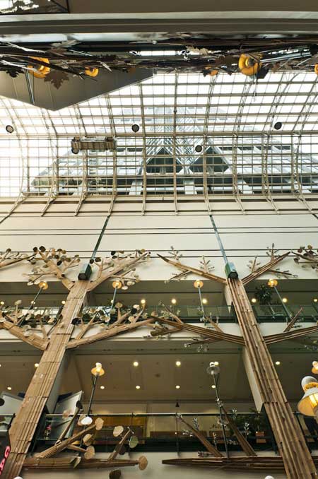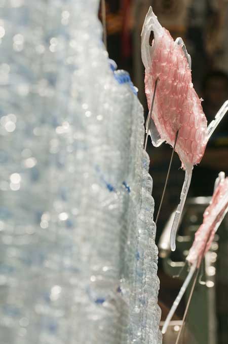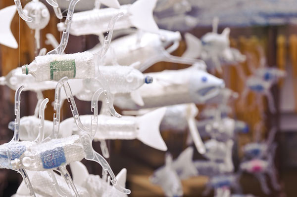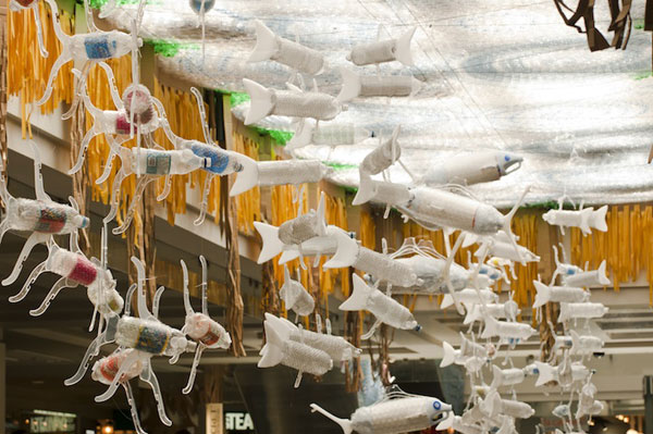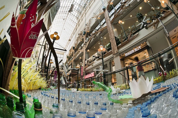 台灣雖然資源回收做的好,不過有時候這些瓶瓶罐罐除了拿去回收桶仍掉以外,也可以有其他的功能。加拿大魁北克蒙特婁的一間巨型百貨Eaton Center中出現了一座使用了水瓶、泡泡紙、衣架,以及厚紙板等所創造出的人造池塘。如果納入池塘周遭的布景,例如樹木、魚等,總高度高達五層樓。
