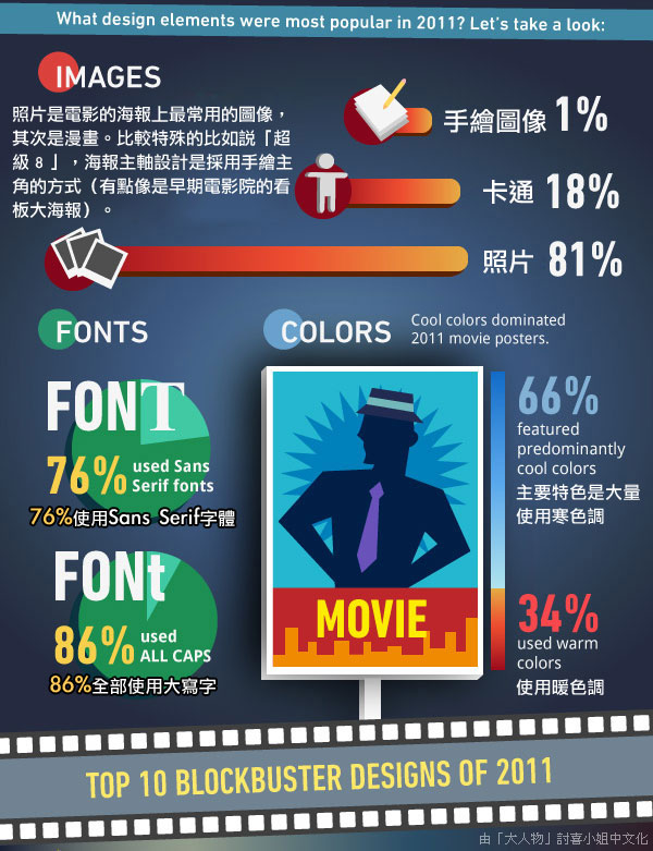 回顧一下大人曾經介紹過電影海報的設計捷徑模式「第一次做好萊塢電影海報就上手!(誤)」,相信有認真把該篇文章看完的朋友,肯定也對電影海報設計這塊領域,多多少少有些許的概念了吧!而百視達精選出2011年最新的電影,從超過1000部的電影中,節選出10部值得細細品味設計的海報,僅供參考是不是那麼實用就見仁見智啦!