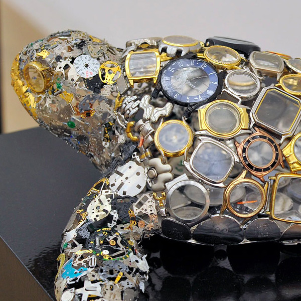 這兩個由數百個老舊手錶零件組合而成的烏龜與兔子頭雕塑,是來自日本多摩藝術大學(Tama Art University)的雕塑家本田奈津美的作品,作品名稱叫做「Time to be included」,瞧瞧作品的做工相當精緻,要將這麼多的零件拼湊成動物造型也是件大工程。