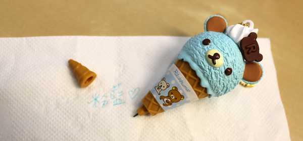 外盒包裝走的是粉嫩嫩的粉紅色點點圖案,最上面有嬌嫩欲滴的粉紅色奶油,加上冰淇淋頭的拉拉熊,真的會在這樣冷冷的冬天忍不住很想去買隻冰淇淋吃阿!總共有六種款式,是冰淇淋同時也是原子筆喔!從左開始,小雞在頭上的是咖啡摩卡口味(棕色原子筆)、薄荷口味(粉藍色原子筆)、有葉子在頭上的是焦糖口味(黃色原子筆)、巧克力口味(紅色原子筆)、草莓口味(粉紅色原子筆)、香草口味(黑色原子筆),再也不用擔心身上沒有筆可以臨時記事囉!
