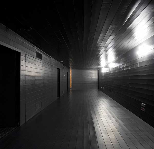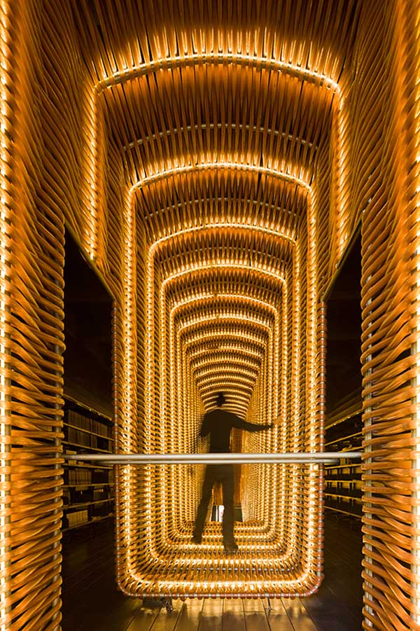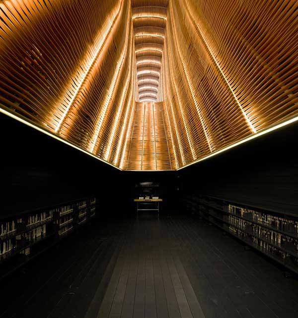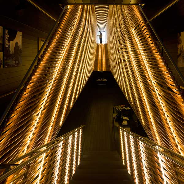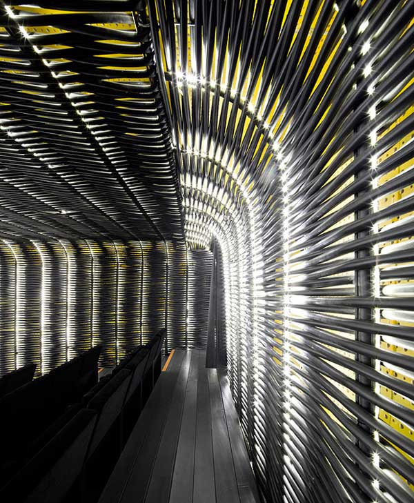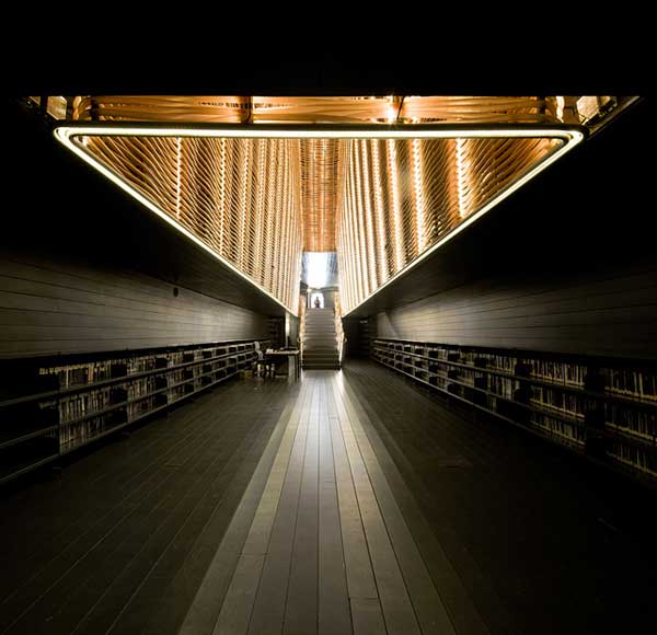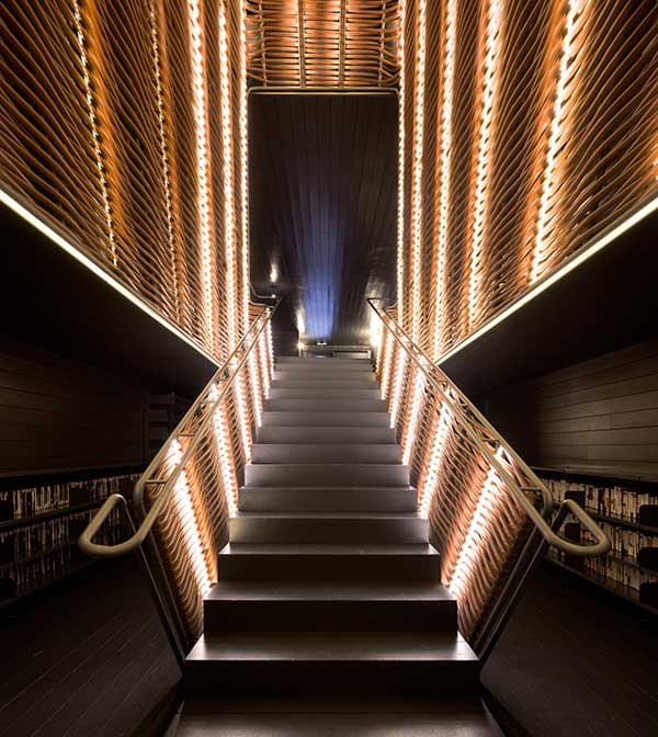 電影圖書館的地板、牆壁和天花板,全都鋪設黑色木板,穿越中央的樓梯,欄杆上的塑膠燈管與地板平行,遠遠望去,明亮的燈光整齊劃一的排列著,走在其下,頗有另類星光大道的感覺。
