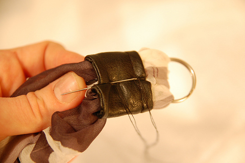 步驟六:將皮革與絲巾縫住,記住,要縫牢喔!