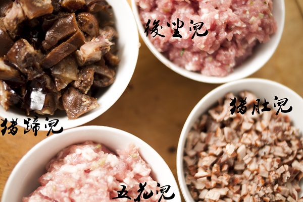 那這宇宙大燒賣到底是如何製成的呢?呃…因為要把怎隻豬包進去實在是太誇張了!所以用了豬的各個部份的肉來代替。這裡用了四種肉:豬蹄切塊、豬肚切末、五花肉和瘦肉。將這些材料剁碎後,加入蔥、薑粉、白胡椒、糖、鹽、料酒、醬油和香油來調味。