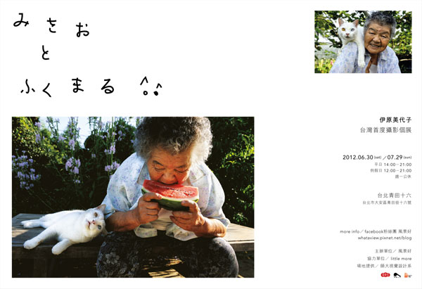 經由台灣風景好視覺美感教育推廣協會邀請,我們也有機會親自感受到伊原美代子真誠動人的攝影魅力,這也是風景好繼2011年川島小鳥「未来ちゃん」之後,第二位邀請到的日本青年人氣攝影家於台灣舉行首度攝影個展。伊原美代子首度海外攝影個展「みさおとふくまる(Missao & Fukumaru)」6/30(六)~07/29(日)於台北青田十六(台北市大安區青田街16號)展出逾40幅精彩作品,其中更包括未收錄在寫真書裡頭的獨家照片,入場費每人NT100!伊原美代子本人也會在6/30(六)pm2:00~6:00舉行簽書會,7/01(日)舉行創作分享會,報名詳情請上風景好部落格:http://whataview.pixnet.net/blog 或專屬活動網頁:http://misao-and-fukumaru.blogspot.com/