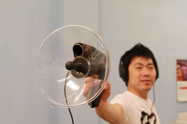 沒錯!你沒看過,這個看起來像是狗仔隊竊聽器具的玩意,其實正確的名稱是「生態遠距觀鳥集音器」,顧名思義,它是拿來生態賞鳥並且可以錄製鳥叫聲用的,但是基於大人物精神,怎麼可能老老實實這個好物拿來賞鳥哩?!(謎:其實是不想出辦公室吧XD)