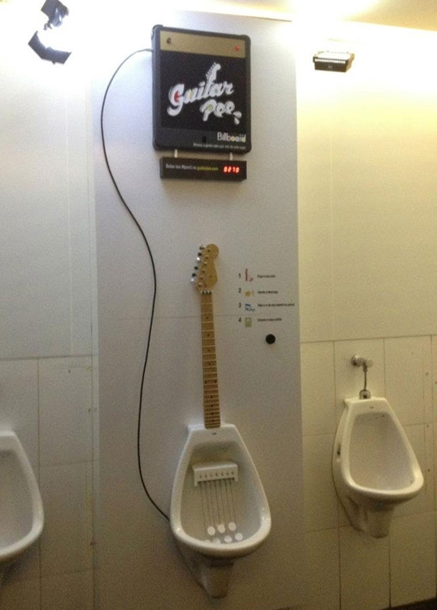 小便吉他是美國告示牌雜誌為了像世人宣告他們對音樂的熱愛與專精,在巴西聖保羅所推出的宣傳活動。他們在廁所的小便斗裡裝上電吉他元件。這一套吉他不需要用手彈奏(誰想啊!!),而是依賴每道「水柱」的力道和方向控制,所以不同的人來使用,就會彈出不同的音樂。還真符合有句俗話說人手一把號、各吹各的調啊!