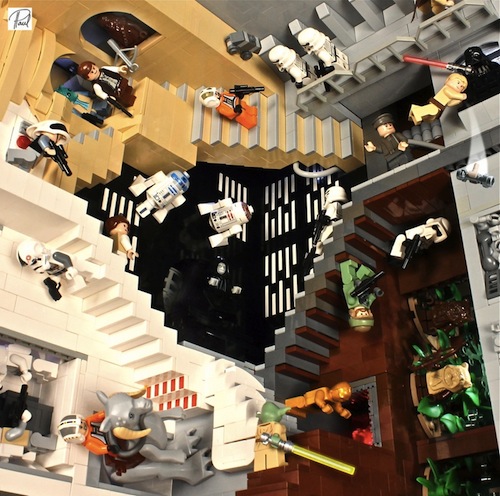 為了向M.C. Escher致敬,樂高玩家Paul Vermeesch打造了一座1x1x1英呎高的樂高模型,是根據荷蘭錯覺大師M.C. Escher的名作 Relativity (1953)而製作,而不同的是,原作上頭的人物全部換成了可愛的星際大戰角色,像是黑武士、天行者路克、尤達大師等等,「我試圖用幾何學跟正確比例重現Escher的作品,同時將星際大戰的顏色、格局跟角色重現他的作品」Vermeesch表示。