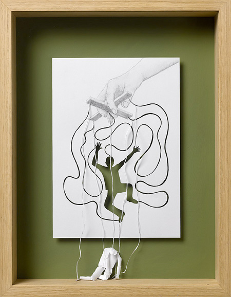 這幅名為Half Way Through逃離一半的作品,從作品名稱就可以窺知大師的創作意圖,Peter Callesen表示,該作品表達出人們常常會想要逃離一切,雖然作品中的人物已經成功脫離了一半,但依然無法脫離本源(那張紙),也根本不可能逃離作為紙的命運。