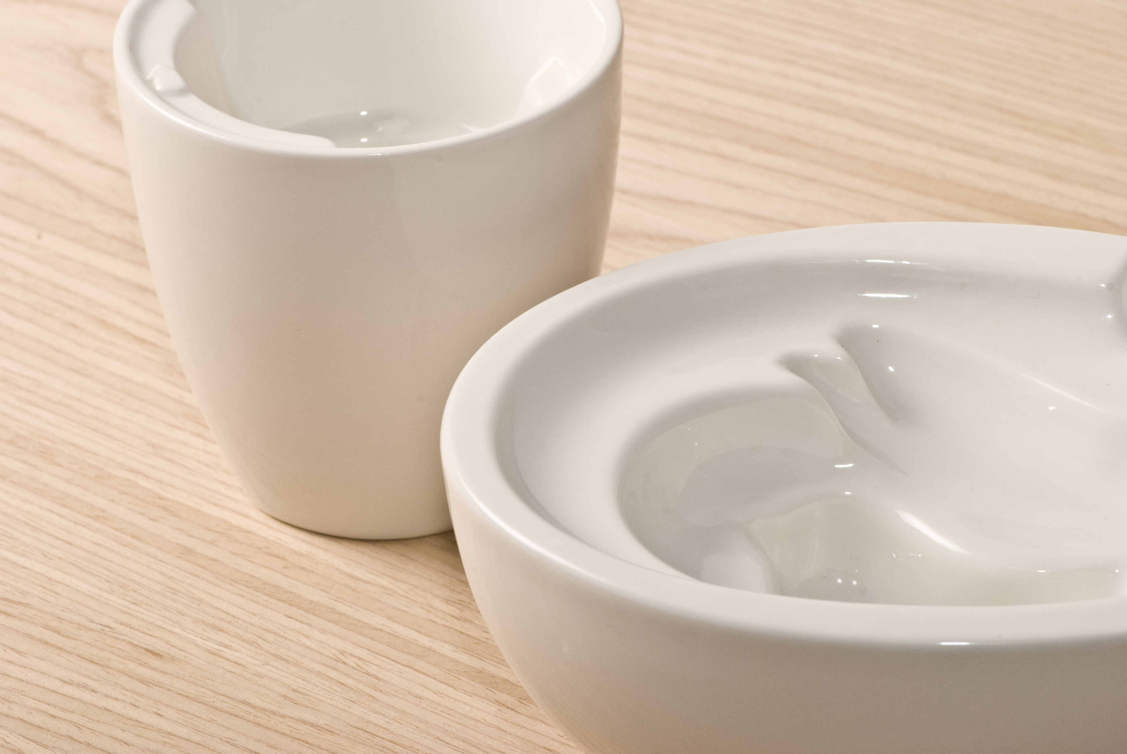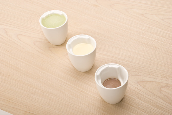 早上一杯奶茶、下午一杯冰拿鐵,當我們面對心愛的飲料的時候,是否常常忘情地喝了太多了?【Bon Appétit 食器組】的杯子以螺旋式的階梯向下做設計,用份量分層的概念做延伸,當你喝的越多要爬得階梯也高,就表示你得運動得更多才能消耗掉你所喝進去的熱量。其中豬是300c.c.;兔子是 200c.c.,而鳥是100c.c.的量。