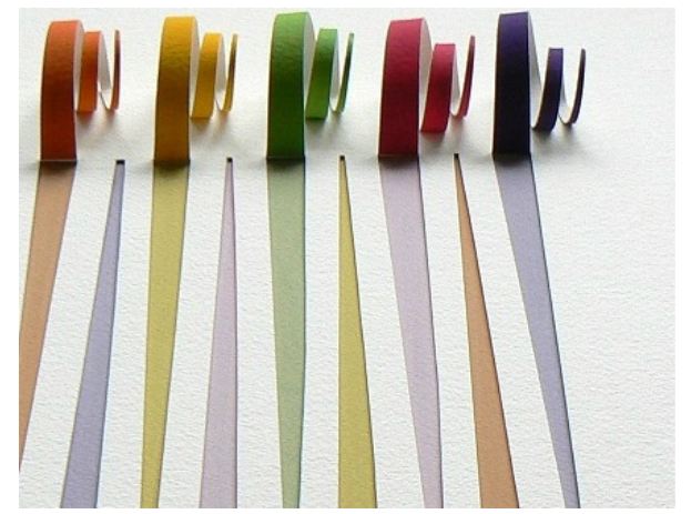 每張紙都有正反兩面,只要善加利用就可以組合出許多驚喜,Lisa Rodden 利用紙雕產生的空隙來玩色彩遊戲,有時候是兩張雙色紙相疊、有時則選擇讓顏色從割開的形狀中透出、做出色彩漸層效果,對她來說,『紙』只是完成作品的元件之一,顏色也是同樣重要的創作素材。