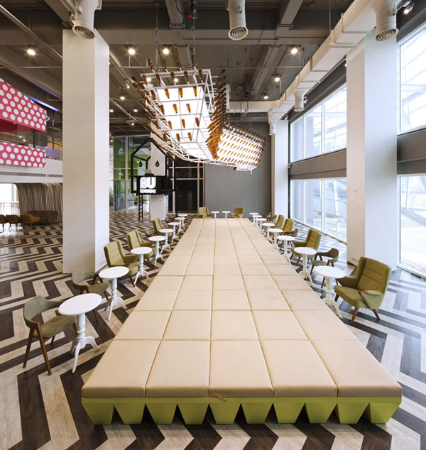 期末考到了要溫書,也可以從藏在熊貓裡面的螺旋狀樓梯走下來到樓下交誼廳溫書,是的,6.5 公尺高的熊貓擺在那,可不只是幫空間裝年輕用,熊貓的背部和後腦杓,就是樓梯的出入口,把頭從笑得合不起來的嘴巴露出來,還真有種人入熊口的錯覺。
