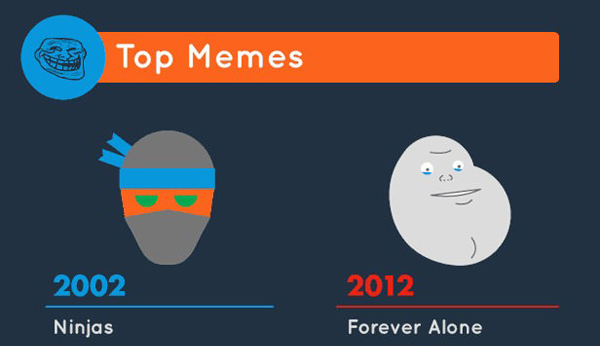 memes是一個有點深度的字眼,源自於理查.道金斯 (Richard Dawkins) 1976年《自私的基因》(The Selfish Gene) 這本書中,粗略的定義為「一個文化傳播單位或一個模仿單位」,把某一種想法信息想像成基因般會複製演化,也因為一個人傳給另一個人而會有令人無法掌握的突變轉換等等,但不是模仿,更貼切的說法是傳染。2002年的主角是忍者,所以2012年的主角就是那些好好笑的漫畫了阿,也因為網友的創意,演變出各式各樣的創作,而且這股熱潮似乎沒有上限。