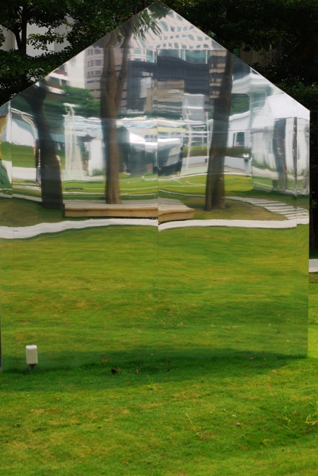 剛才不斷提到的「隱形小屋」其實也有很深遠的創作意涵,由建築設計師方瑋所打造的鏡面材質小屋可以反射出環境中的自然景象、移動中的人群與事物,將這些可動可靜,以及不可預測的活潑影像帶到參觀者的眼中,隨著不同的角度,呈現多重角度的自然新風貌,尤其是在雨天或尚未開館前,小屋房門關閉時更可以看到一座座小屋融入了自然環境中,無限延伸的草皮帶來開闊的美感。