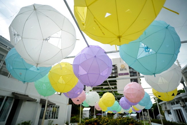 花花綠綠的傘不只在雨天才看的到,在大晴天的勤美術館裡也看的到,由倫敦奧運場域總設計團隊AECOM帶領淡江大學建築系學生所設計出來的「Daily Life Jungle」,試圖讓從傘間灑落的點點陽光,為夏天帶來涼爽的綠蔭。不過比較可惜的地方是因為先前的颱風已經將這美好卻脆弱的創作毀壞,勤美術館館方不願讓這麼好的創作概念消失,運用僅存的傘支重現其主題中心概念,創作出來的成品與先前網站介紹過的「葡萄牙七彩雨傘街:傘傘動人迎接每一天!」有類似的感覺,重生後也是一幅美麗的風景。