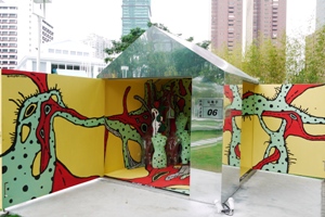 既然說到了雨天,那就不能不提到創意總監的私房景點,在每棟隱形小屋的牆面上都有鷹眼(貓眼),透過這個鷹眼可以看到不同風貌的作品形式濃縮在這個小小的畫面中,凸透鏡的效果讓每件作品都顯得更有張力,而且這個欣賞作品的方式只有在雨天關閉小屋房門的時候才能夠看到。雖然雨天沒有辦法盡情的欣賞作品,但卻有另外一種情趣,三三兩兩的人群撐著五顏六色的傘,倒映在隱形小屋的牆面上,這繽紛的畫面讓小屋本身就是一件藝術品,而且是由大家所集體創作的藝術品。