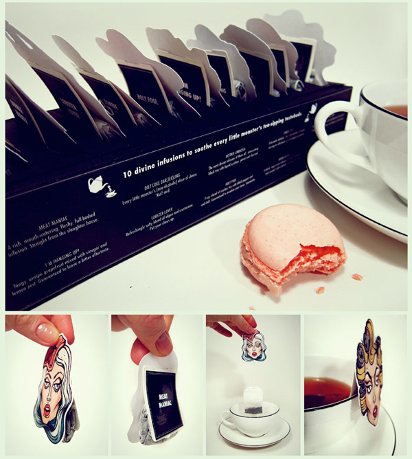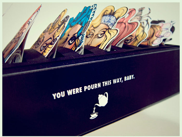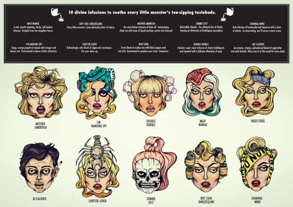 Nathalie Hallman 本身是設計系學生,為了申請進入瑞典斯德哥爾摩藝術大學,她製作了《GAGA TEA》盒裝茶包,以卡卡的各種經典造型來繪製紙標,例如泡泡裝、生肉裝、以及怪獸之母等,不僅將卡卡那種煙視媚行的韻味描繪得非常週到,每隻茶包也有各自代表含意,將不同造型的代表歌與茶包的名字做連結,細節上設計得頗為到位。