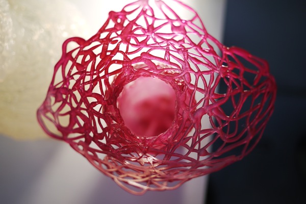 由熱融膠製作而成的脫殼系列花器,色彩繽紛、質地Q軟,打破一般人對花器硬梆梆的概念。鏤空的網狀結構內底部裝入透明的塑膠容器,不但沒有破壞整體質感,更讓花器能順利裝水來完成使命。