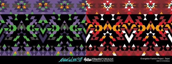 至於印地安民族風Pattern,則是以近期較為大眾所熟悉慣用的流行圖像思維和非ACG的方式呈現,因此選擇將EVA機甲解構後組成的EVA印地安民族風為主軸開始進行有邏輯性系統化的應用至各項商品上,這也就是Filter017所推崇的邏輯性系統識別圖像。