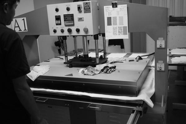 熱昇華(註3)印刷廠技術人員仔細的看著剛出爐的傘套, 檢視有無鬼影現象,並檢查傘布收縮後印刷位置是否有偏差