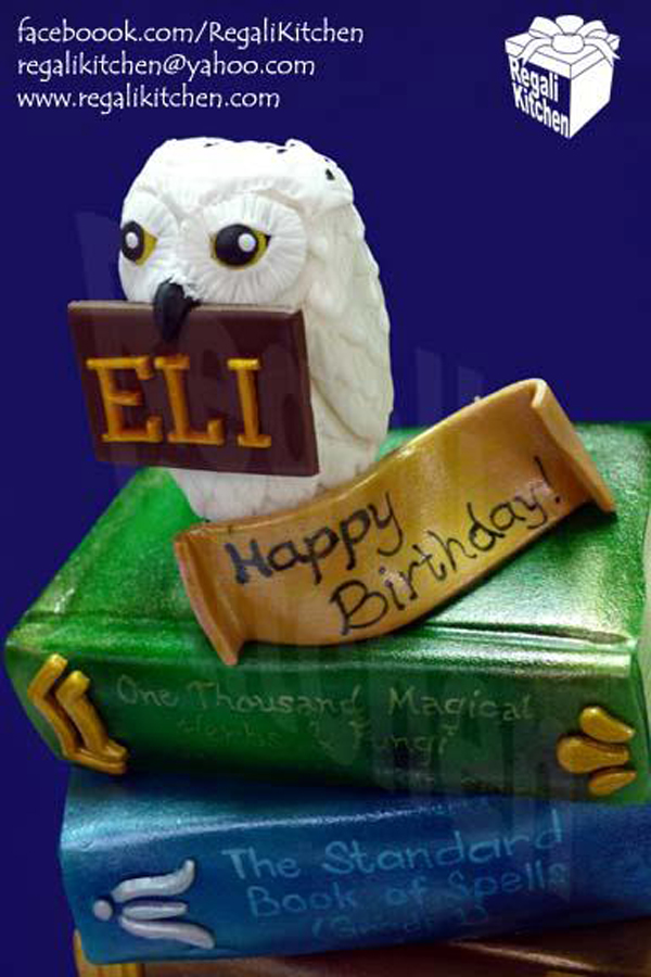 雖然是給小朋友的蛋糕,細節也不馬虎,細緻得驚人!蛋糕頂部站著縮小版的可愛嘿美叼著給艾爾的入學信封,腳邊飾有以巧克力製作寫有「生日快樂」字樣的仿羊皮捲軸,這位小壽星真幸福,連嘿美也來祝他生日快樂!