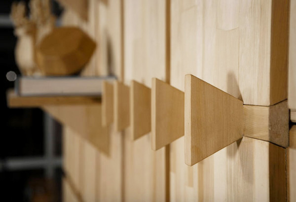 利用鳩尾榫(燕尾榫)技法,除了可以自由配置收納空間之外,最棒的好處自然就是能夠不著痕跡地更改擺放的位置(不過當然,可不能三天兩頭就換),這就不是鐵釘這種破壞性的工具能做得到的了。