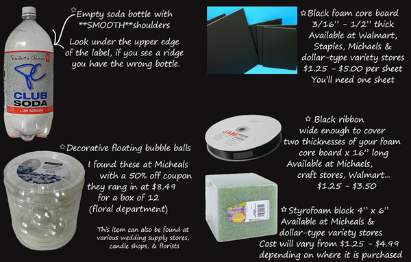 需要的材料與工具有:一般兩公升裝的汽水瓶、玻璃彈珠、黑色硬紙板、發泡海綿等。