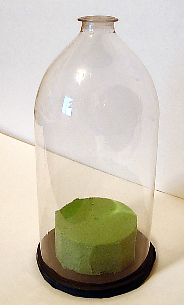 黑色硬紙板做為收藏鐘罩的底座,並且固定發泡海綿,同時可以利用插花常用到的泡海綿來裝飾鐘罩,作一些情境布置,包括一些乾燥的植物或是苔類等等。