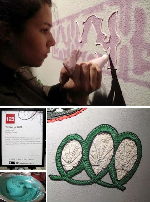 看完兩張細部的特寫照片,大家猜出來是什麼了嗎?其實看起來像黏土的材質跟土一點關係都沒有,這全部都是由蛋糕上的糖霜所做成的!完全沒想到食材也可以拿來用在壁畫創作上,把牆壁當成蛋糕抹上一層又一層的糖霜,真的讓人好想偷偷舔一口啊(誤)!現在的蛋糕雖然越來越少利用糖霜來做裝飾,不過想起小時候的生日蛋糕上總會有個用糖霜做成的動物或人形,還真是令人懷念~