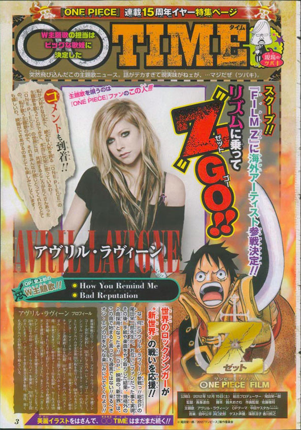 這次,即將在12月15於日本上映(台灣預計2013年1月25日)的 《ONE PIECE:Z》,聲勢浩大。在配樂上,以搖滾小天后艾薇兒 Avril Lavigne 翻唱瓊安傑特 Joan Jett 的《Bad Reputation》與五分錢樂團Nickelback的《How You Remind Me》兩首歌做為主題曲。
