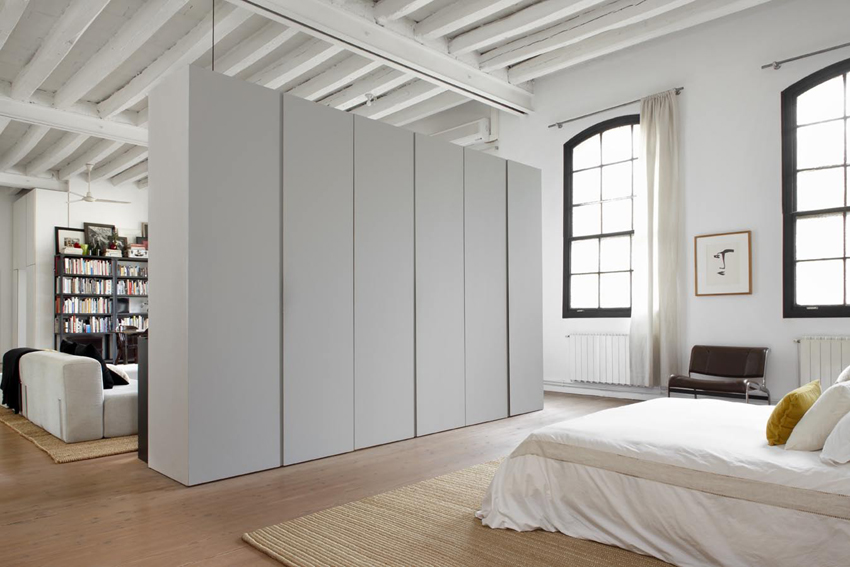 臥室以類似屏風的牆面來作區隔,既不影響寬敞的空間感也保留了臥室應有的隱私。