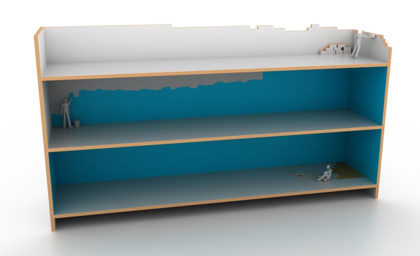 由 MEJD Studio 設計的『Build me up』造型書櫃,將組裝書櫃轉化成蓋房子的意象,書架上的小人有的拿木磚、有的負責油漆、有的處理地板貼皮,各司其職慢慢完成完成一座書櫃,而留白的牆面與堆疊角落的磚頭,讓時間永遠停留在未完成的瞬間,別出心裁的設計除了讓你不用煩惱如何裝點書架風格之外,也可以隨時提醒自己,每樣東西的生成並不是平白無故迸出來的,要珍惜背後每個看不到的付出。