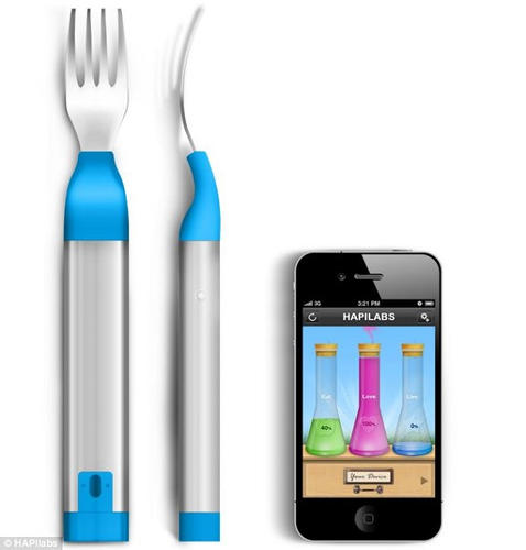 來自美國的 HAPIfork 可以無線傳輸紀錄使用者吃進多少東西,以及進食的速度,並以振動、警示燈閃爍的方式提醒使用者。研發出這個智慧型叉子的 HapiLabs 指出,吃東西當然是維持生命的唯一方式,但有些人似乎無法克制,吃太多以及吃太快對身體造成的負擔除了體重增加,還會造成消化方面的問題。