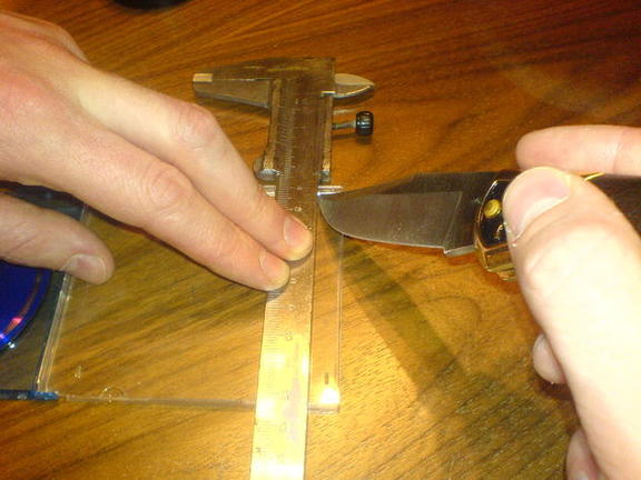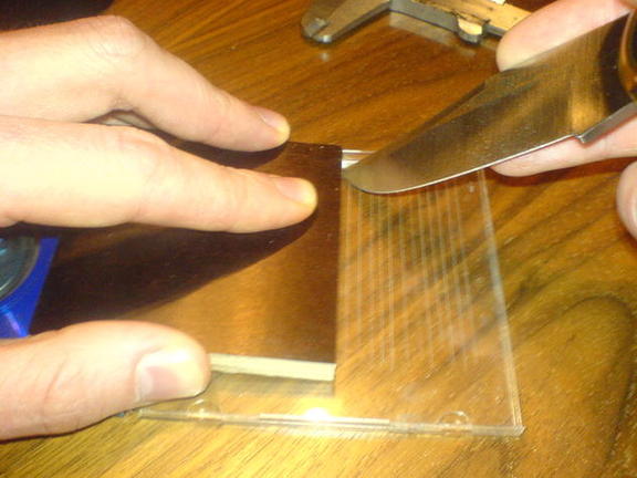 1. 在塑膠片的表面,用直尺跟刀刻上平行線。這是非常重要的:別切斷塑膠片,只要刻上線條便可。線跟線之間的距離約為 2mm ,而這些平行線應覆蓋整塊塑膠片。(它的長度要足夠覆蓋相機鏡頭)