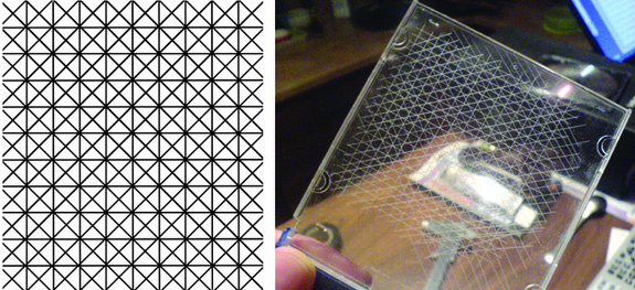 2. 把塑膠片 90 度旋轉,然後以同樣方式刻上同樣的平行線,此次的線條應和步驟 1 所刻的線條成垂直角度。