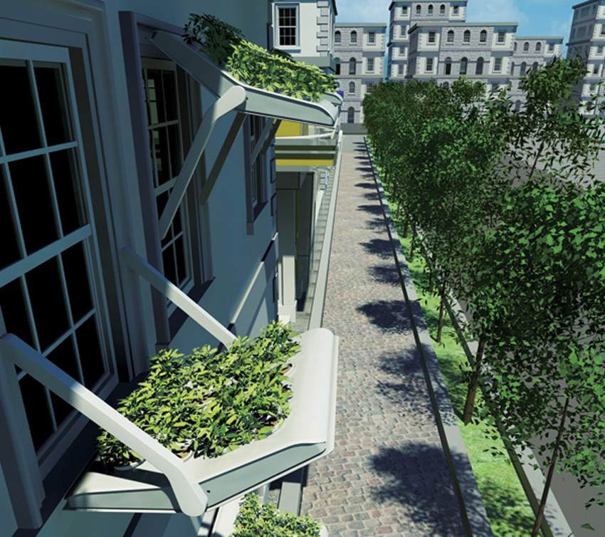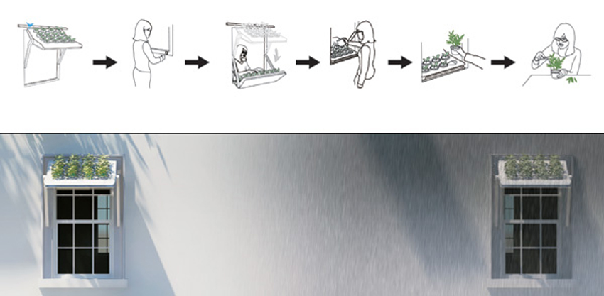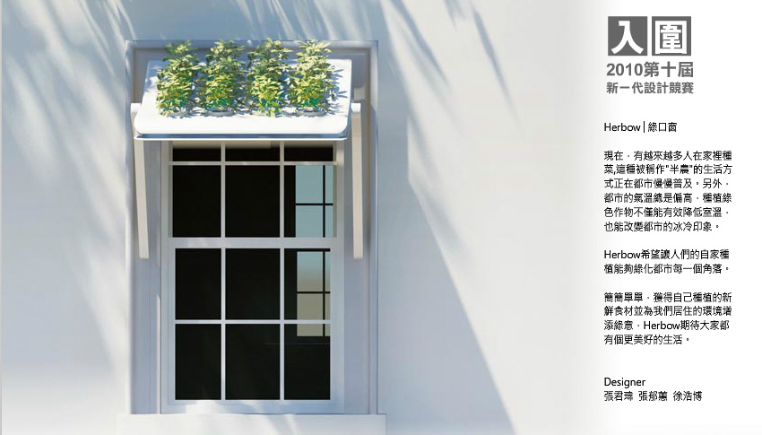 這次我們在 2012 年紅點設計獎的得獎作品中,赫然發現了由台灣國立 成功大學工業設計系 出身的張君瑋、張郁蕙、徐浩博所共同發表的作品 綠口窗,結合植栽與窗簷的設計,為沒有陽台、沒辦法種植需要大量日照的植物或蔬果的問題提供一個頗有趣的解決方案。