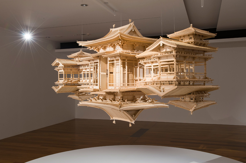 吃慣了大魚大肉,偶爾也會想來點清粥小菜換口味,或許是先前做太多傷眼睛的細活兒,Takahiro Iwasaki 最近改變手法,完成一座超大的廟宇雕塑,名為「REFLECTION MODEL」,以等比例復刻京都的平等院byodo-in,模擬水中倒影的鏡象,整個作品吊掛在空中,雖然尺寸比之前的作品來得大,不過看起來仍是險拎拎地讓人大氣不敢喘一口阿!