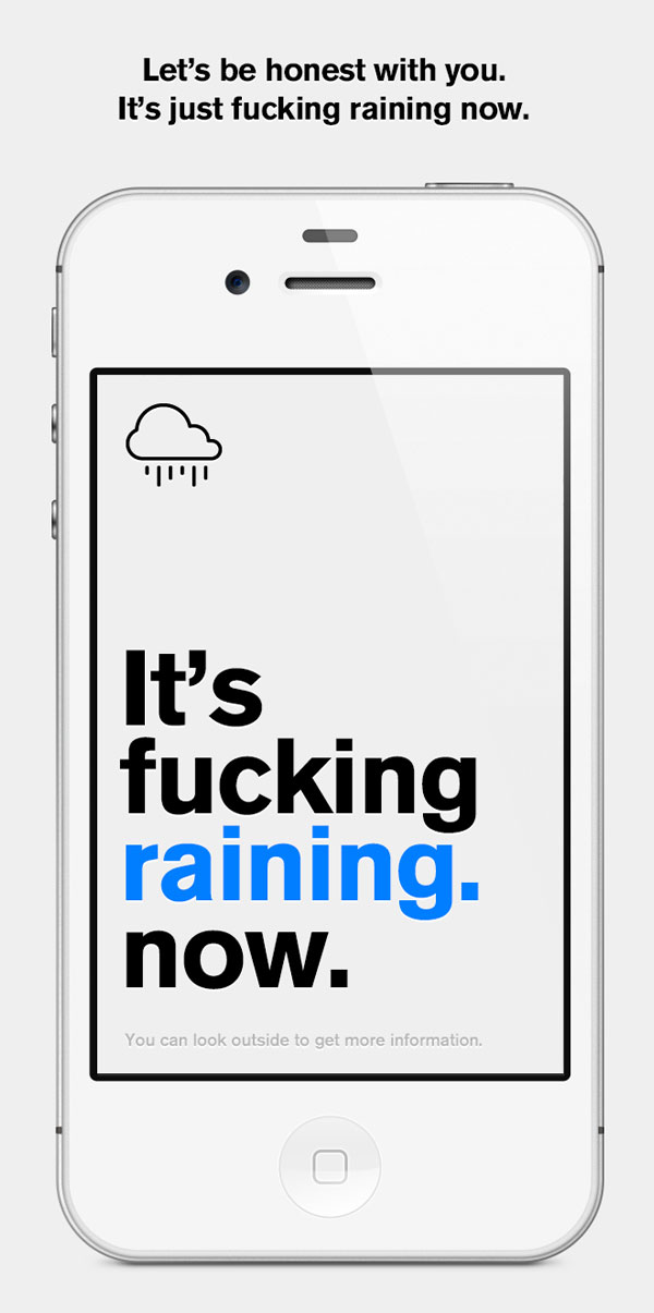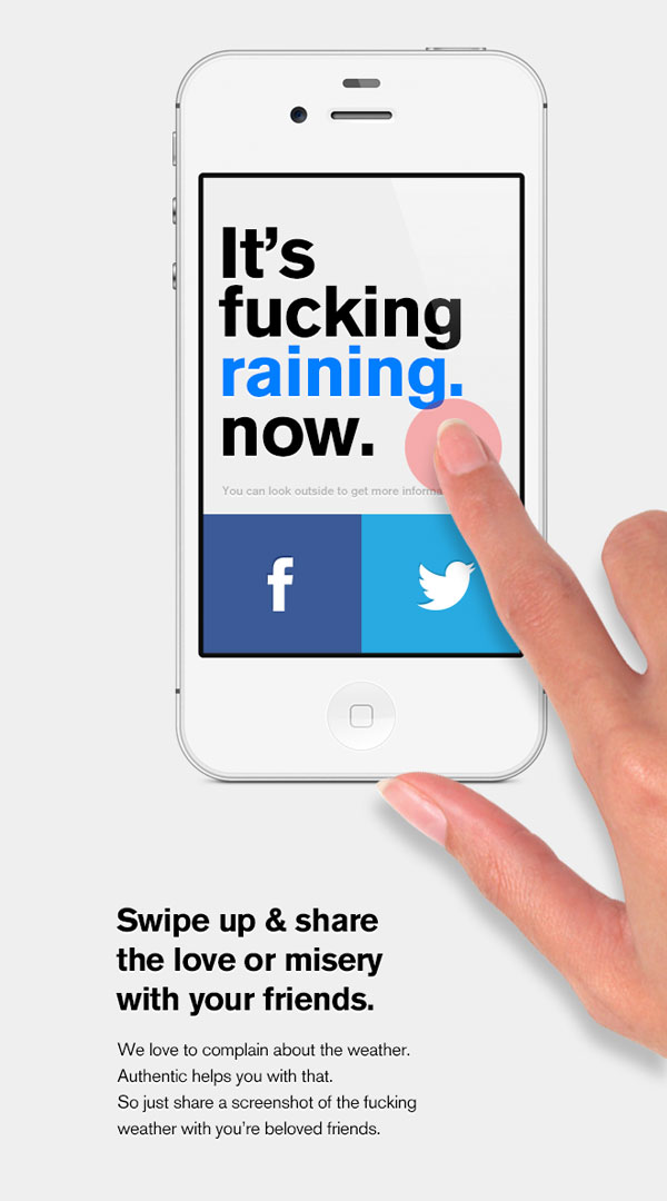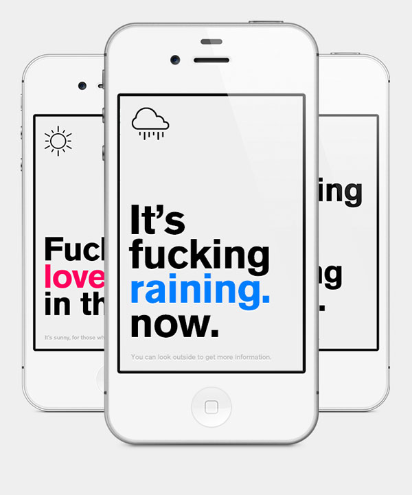 設計師 Tobias van Schneider 可能是常常遭遇到極惡的天氣,或是他本人比較率直修養不是很好,特別研發出了一款叫做「Authentic Weather」的 APP,這個應用程式會利用講髒話的方式預報天氣,畫面很簡單,構造也不難理解,但是確實令人印象深刻。(常罵髒話不好喔!)