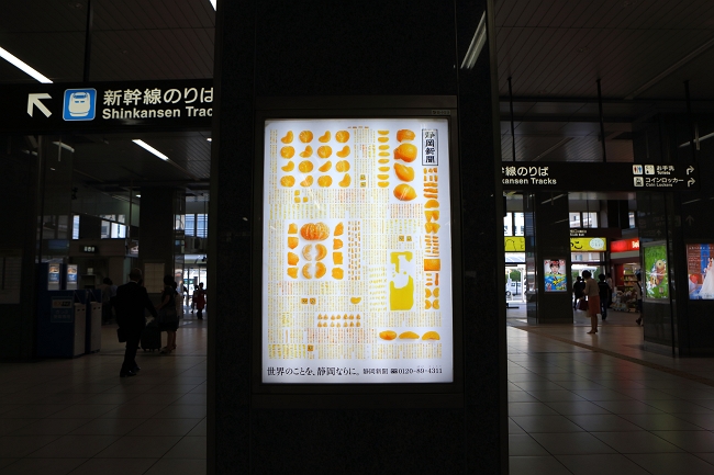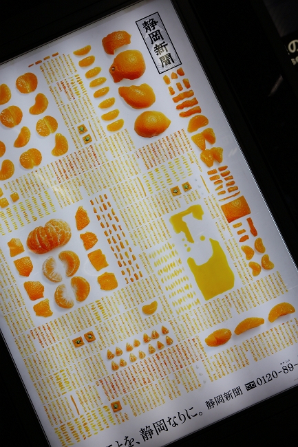 日本JR靜岡車站大廳和靜岡機場皆出現了靜岡新聞(報紙)的平面廣告,不過這個廣告上有99.5%的畫面以靜岡當地名產-橘子、茶葉、富士山所構成,完全沒有「內容」可言,但是強調出在地化精神,令人耳目一新。燈箱上應該找不到白癡腦殘畜牲XXX的小字吧…科科科