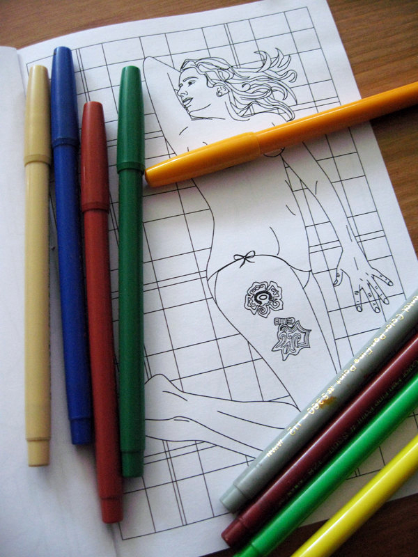 在 Etsy 上的一位賣家 Kira Scarlet ,也許蠻想回味一下兒時著色的快樂時光,但又不想失去身為大人們的嗜好,乾脆混做撒尿牛丸,於是色色的大人版著色畫就這樣推出了!
