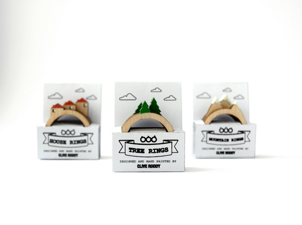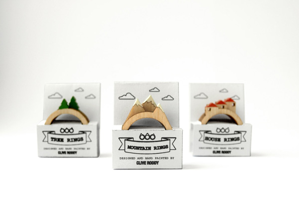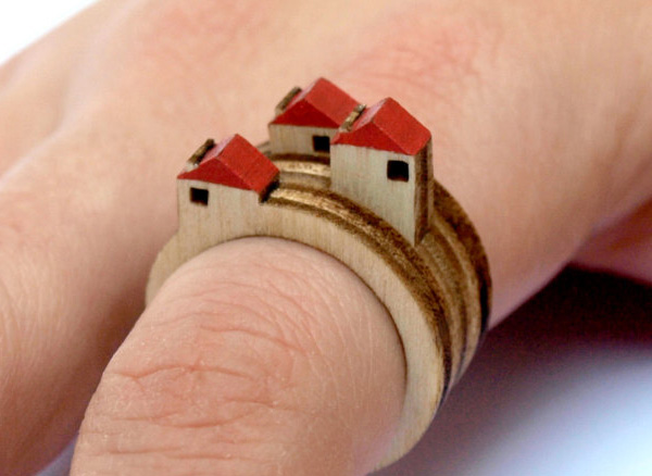 在 Etsy 有位英國賣家 Clive Roddy 設計了一系列超可愛袖珍的小景戒指,微小的屋子或是微小樹木高山,經過雷射切割後成為一個個木製的戒指,依序套進手指後,復古小鎮就這樣躍然上你的指頭。