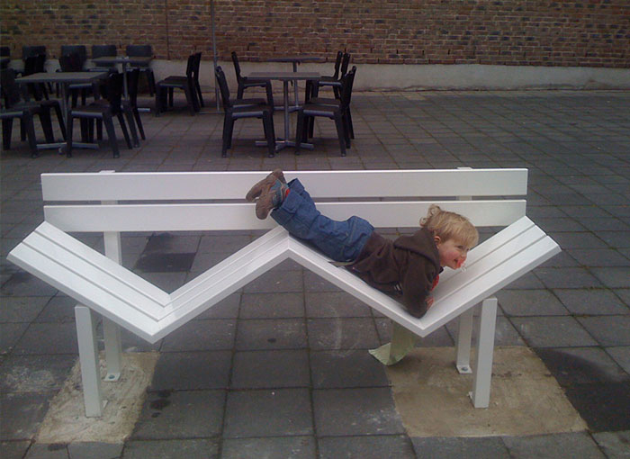 Jeppe Hein 希望可以透過這些裝置藝術,增加人與人之間的互動性,所以除了遊樂性質的設計之外,有些長凳的外型看起來則頗具實驗性質,例如缺腿傾斜或者乾脆只留兩側扶手,坐在上面不見得會有多舒適,不過倒是可以成為人們開啟話匣子的題材喔。